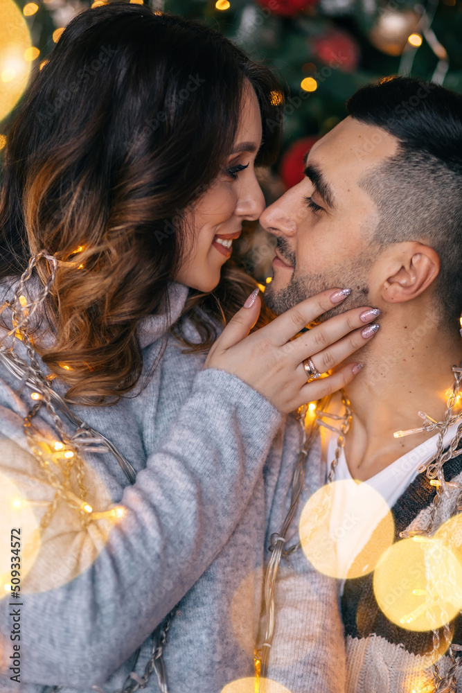beautiful couple hugging on Christmas evening against the background of garlands
