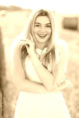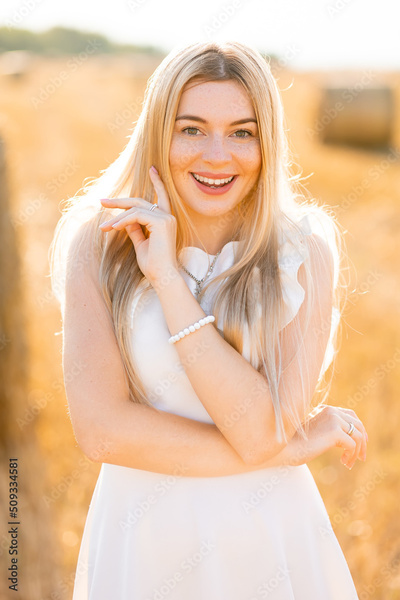 beautiful blond woman resting by the haystack, summer vacation in the countryside