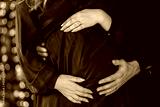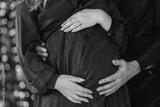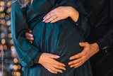 pregnant couple with hands on belly on Christmas, New year background with beautiful fir tree and xmas lights