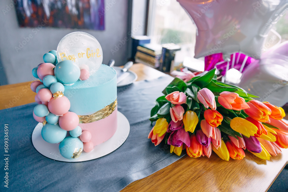 holiday, parents find out the sex of the child. Beautiful pink-blue cake and a beautiful bouquet with a tulip.