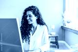 Portrait of young smiling woman looking at PC computer. Happy girl seating in creative office. Successful businesswoman. Modern business woman.