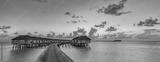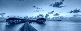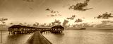 Amazing tropical sunset panorama at Maldives islands. Luxury resort villas seascape with soft led lights colorful dream sky. Fantastic summer holiday concept, vacation landscape sunrise sea horizon