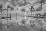 Tropical sunset over outdoor infinity pool in summer seaside resort, beach landscape. Luxury tranquil beach holiday, poolside reflection, relaxing chaise lounge romantic colorful sky, chairs umbrella