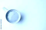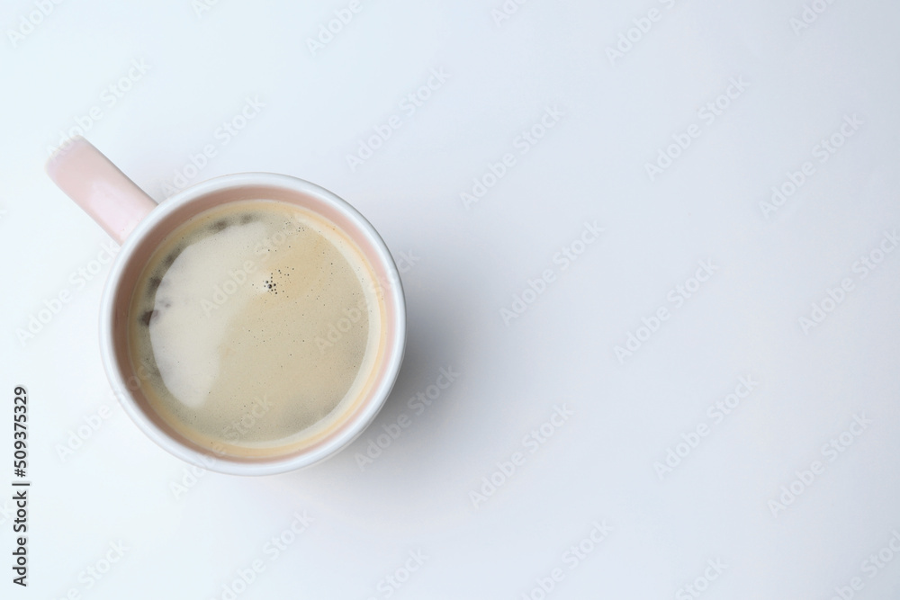 Mug of freshly brewed hot coffee on white background, top view. Space for text