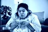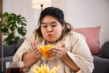 Happy Asian fat woman enjoy eating delicious French fries and potato chips on living room.
