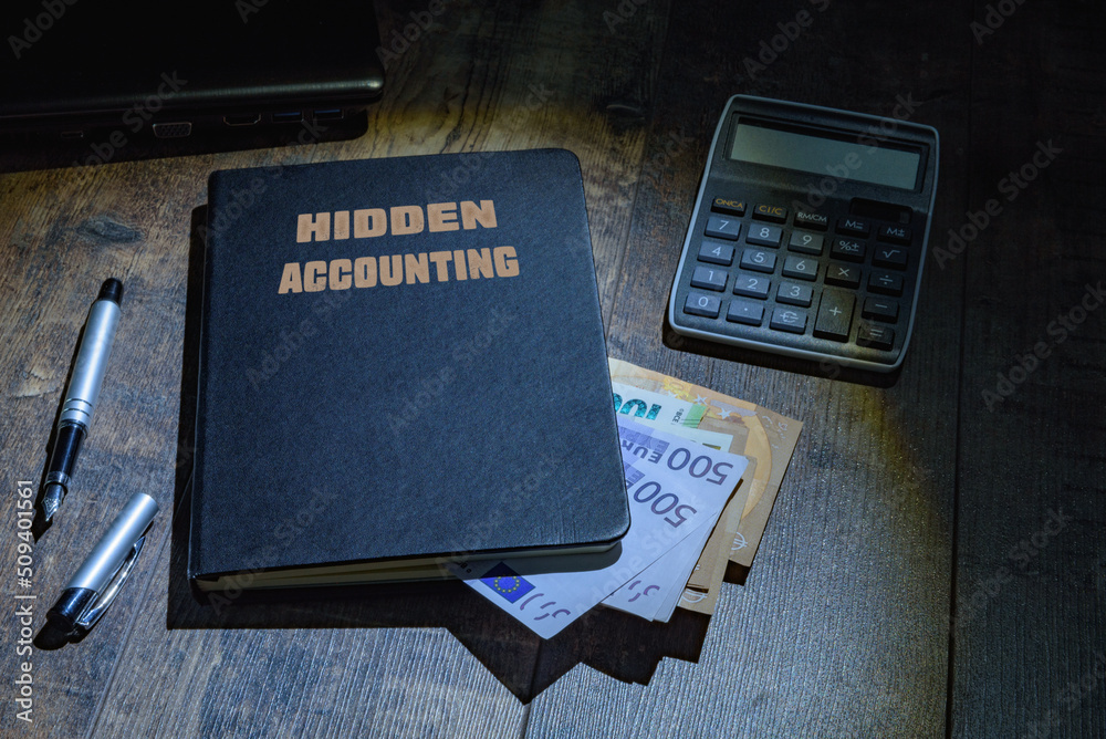 Hidden accounting. Tax avoidance. Account book on the table with cash banknotes.