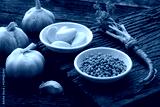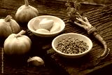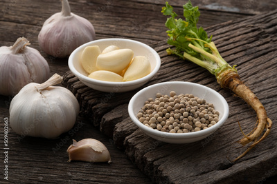 Close up white pepper ,garlic and cilantro root.Three key ingredients known as “Sam Kler” Thai Seasoning