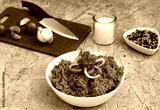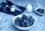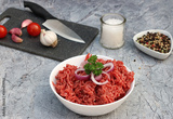 Rohes Hackfleisch in einer Schüssel mit Zwiebeln und Petersilie.