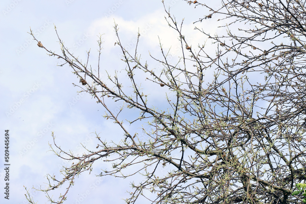 Apple tree damaged by caterpillars of Brown tail moth Euproctis chrysorrhoea. Eaten leaves and damaged young, immature fruit. This is a pest of increasing importance in orchards, gardens and roadside.