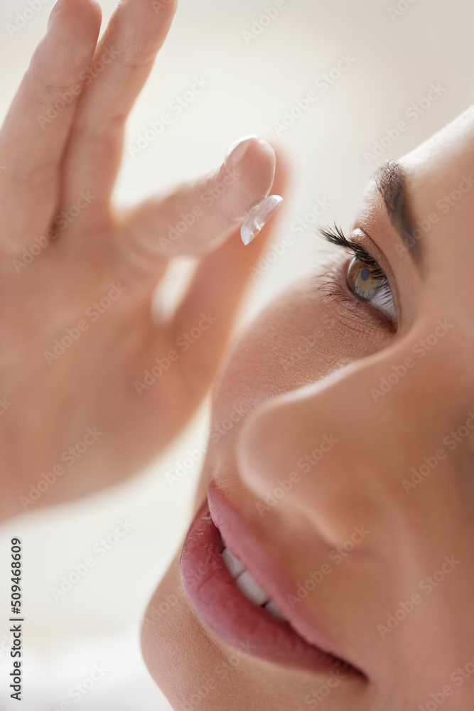 Contact Eye Lens. Smiling Woman Applying Eye Contacts on her Eyes. Close Up View of Cute Lady Preparing to Put het Lens Into the Eyes. Vision Concept