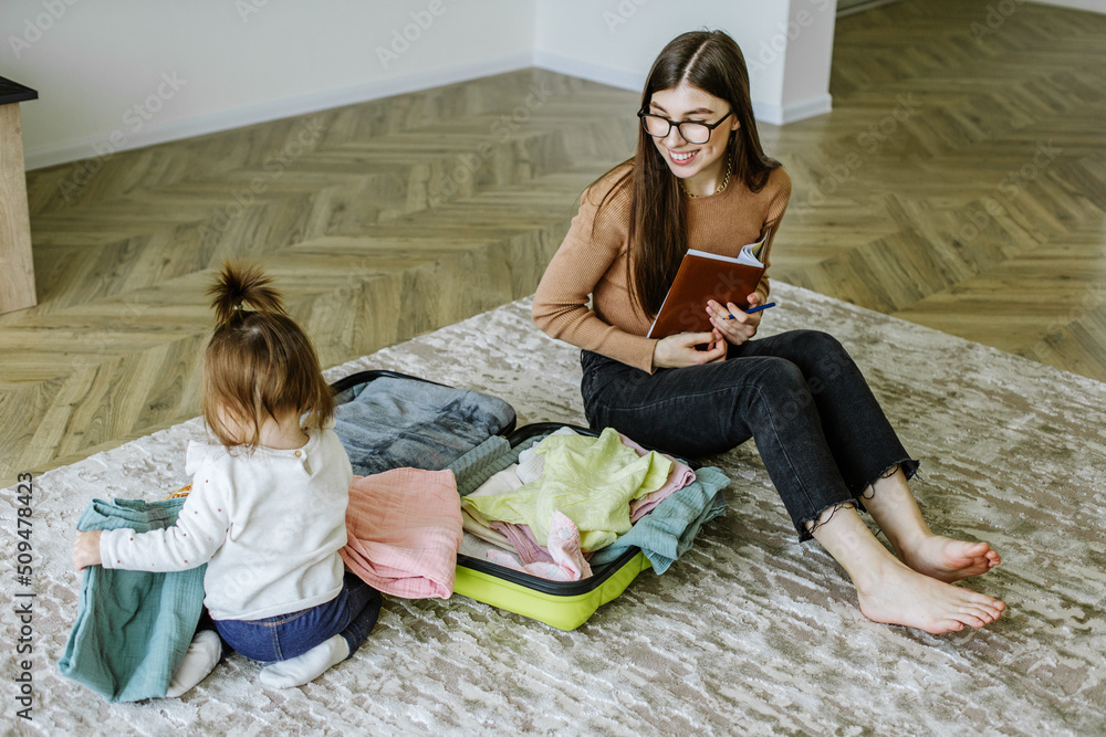 Traveling with children. Happy young mother with little toddler kid packs clothes in suitcase