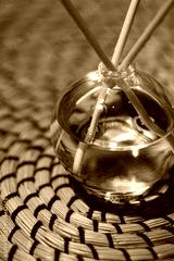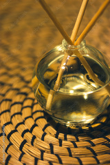 Diffusoria on rattan background. Glass bottle with aroma sticks. Fragrance accessory, home decor. Aroma fragrance reed difusser. Aromatheropy concept. Bottle with scent oil. Perfume for home interior