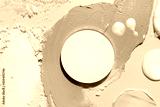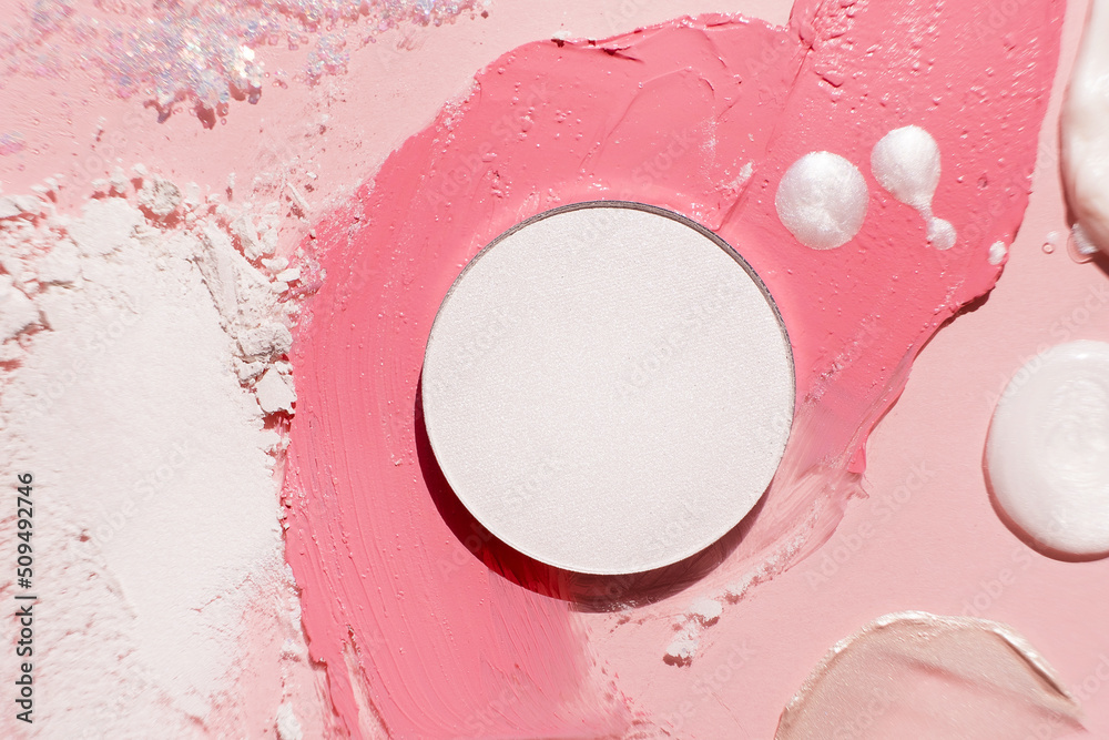 Cosmetics swatches. Peach, beige, red and coral toned styled cosmetics flat lay. Closeup colour palette. Creative concept photo of cosmetics samples. Beauty products on pastel pink background