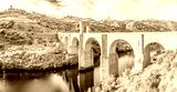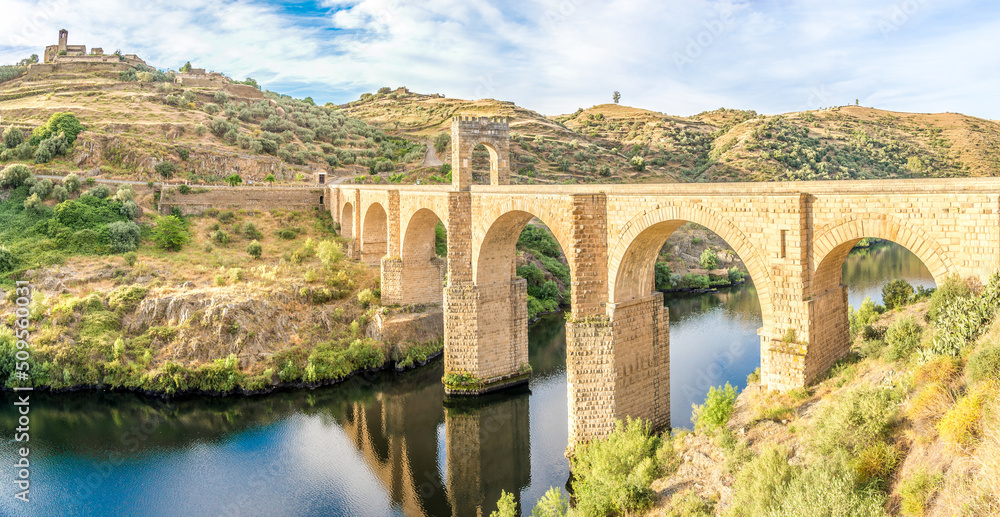 Panoramic view at the ancient Roman bridge over Tajo river in Alcantara, Spain