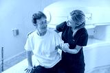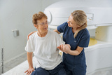 Radiologist help to patient sit after procedure of MRI or CT Scan . High Tech medical equipment