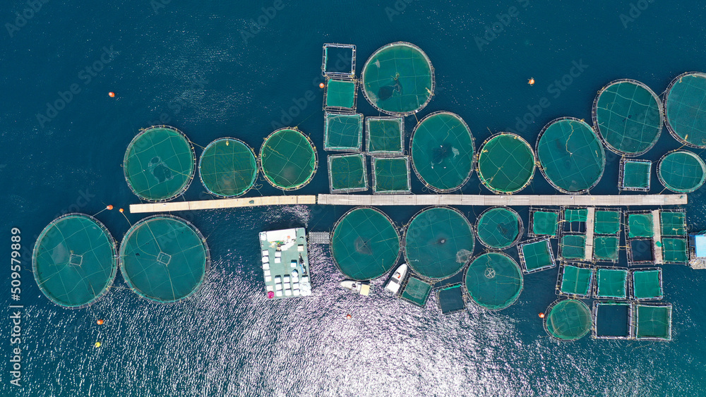 Aerial drone photo of sea bass and sea bream fishery or fish farming unit in Mediterranean calm deep blue sea