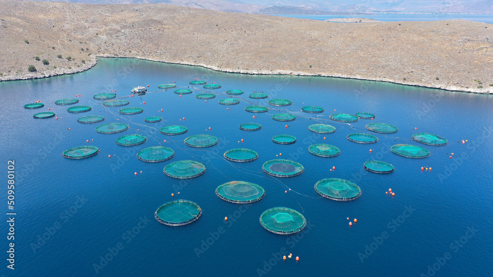 Aerial drone photo of fish farming unit of sea bass and sea bream with round net cages in Anemokambi bay area near Galaxidi, Greece