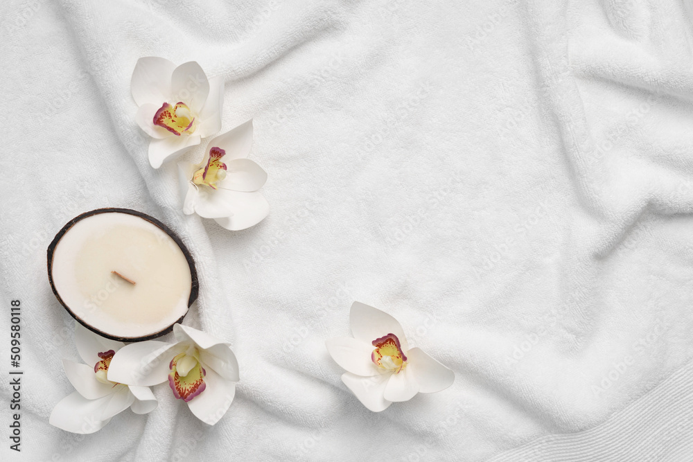 Aroma candle in coconut shell and orchid flowers on a white terry towel. Spa mockup with copy space.