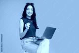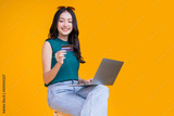 smart asian woman hand using credit card laptop with smile confident and cheerful studio shot,asia young adult woman sit on stool hand gesture hold credit care cashless payment business ideas