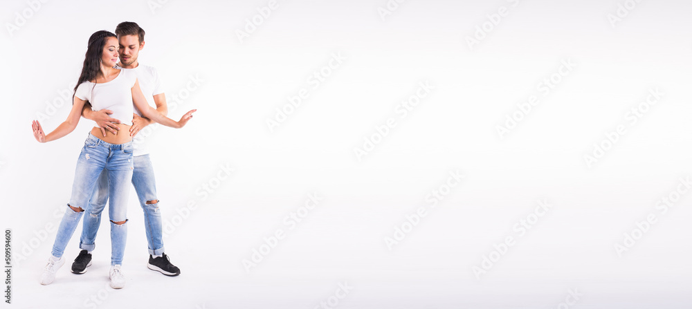 Banner salsa, kizomba and bachata dancers on white background with copy space. Social dance concept
