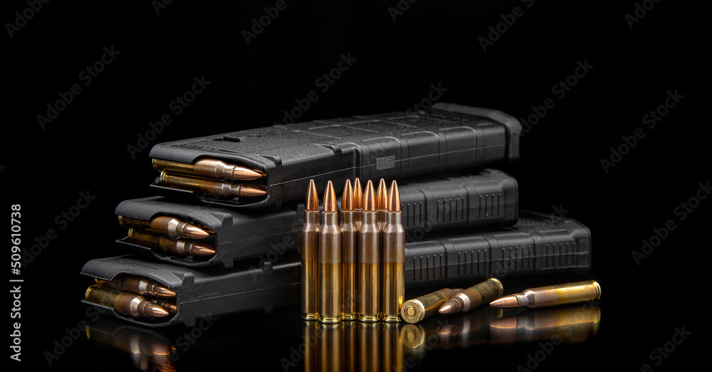 Bullet isolated on black background with reflexion. Rifle bullets close-up on black back. Cartridges for rifle and carbine on a black.