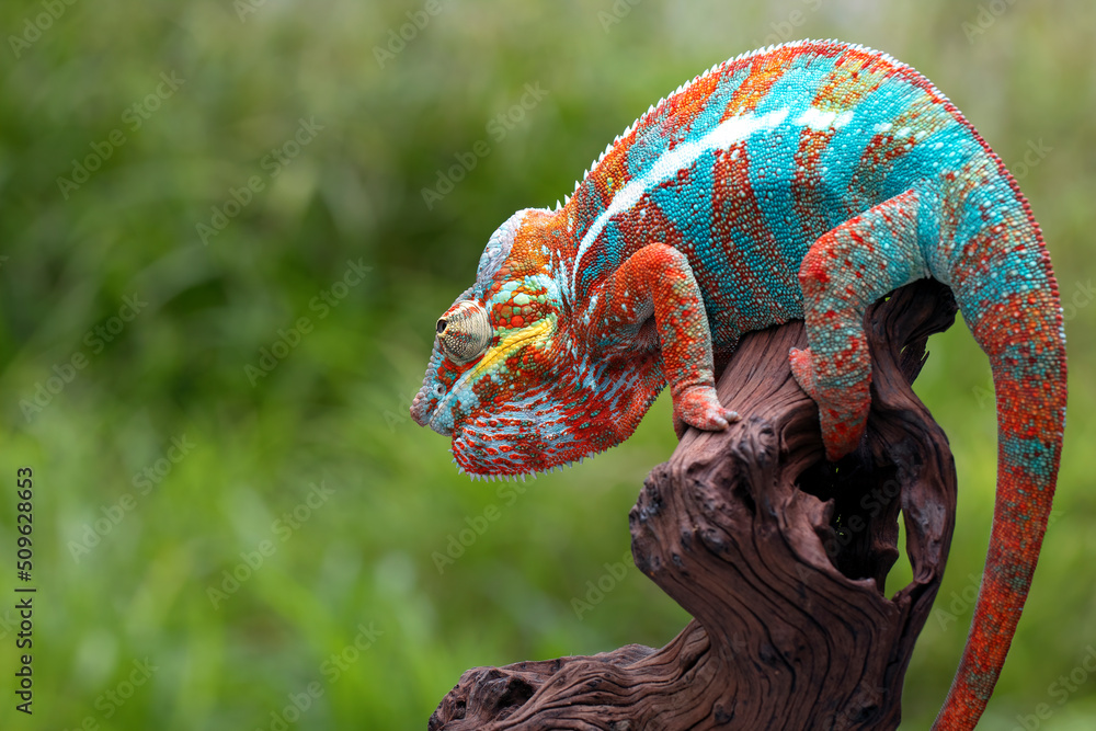 The beautiful Panther Chameleon (Furcifer pardalis) on tree branch.