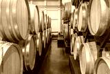 Vintage winery cellar with wine wooden barrels
