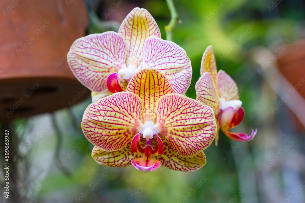 Spotted yellow pink chrysanthemums in tropical botanical garden, jungle. Growing exotic striped flowers with dots. Phalaenopsis Baldan's Kaleidoscope flower popular Moth Orchid hybrid Golden Treasure.