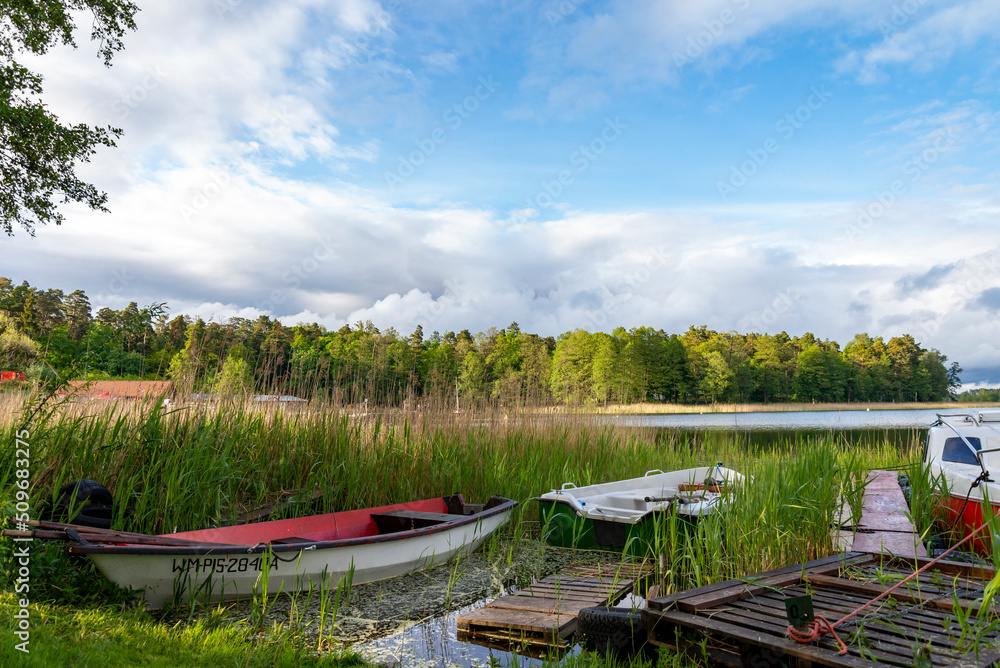 Rowing boats floating over the Lake Selment Wielki waters. Masuria, Mazury Lake District, Poland