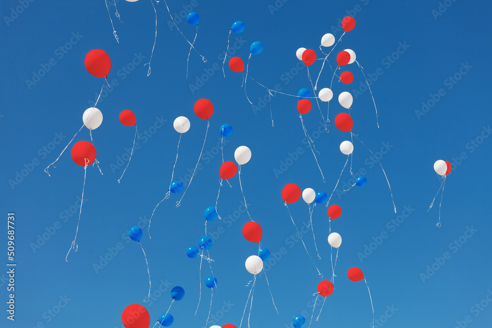 white, red and blue balloons flying all over the sky on a sunny day