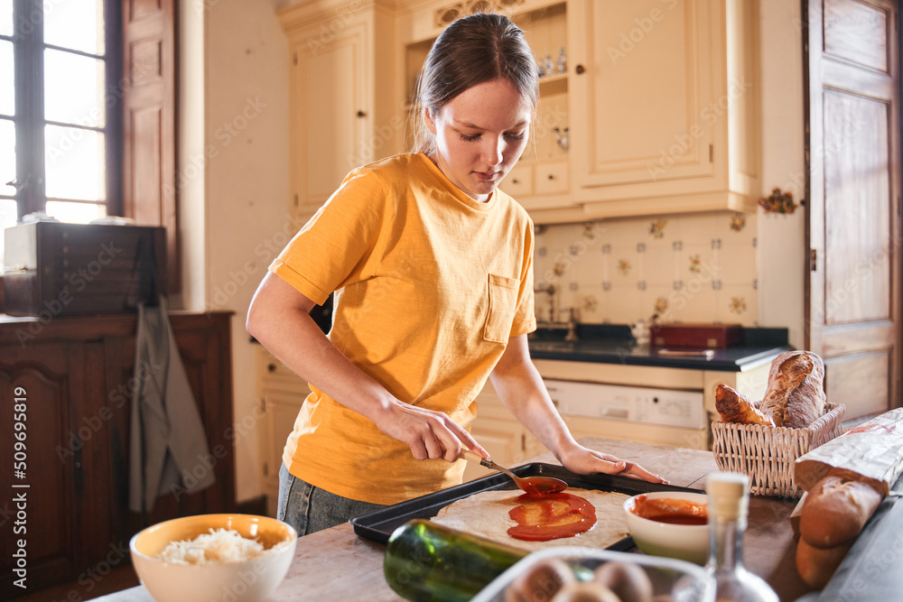 Concentrated teenage girl putting sous with spoon at the pizza while cooking