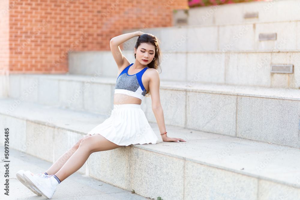 Portrait of beautiful athletic young asian woman in fashionable sportswear standing and having rest after strong exercise training in garden the park,Outdoor Sporty concept