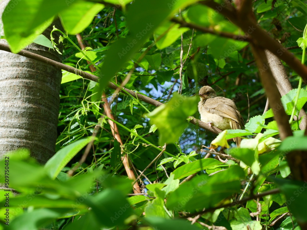 Streak-eared Bulbul (Pycnonotus blanfordi) bird on tree with natural green leaves in background