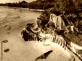 Anse Source d'Argent beach, La Digue Island, Seyshelles, Drone aerial view of La Digue Seychelles bird eye view.of tropical Island, couple men and woman walking at the beach during sunset at a luxury