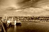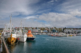 Hafnarfjörður, Iceland, May 8, 2022: colorful boats in the harbour with the equally colorful town in the background