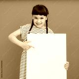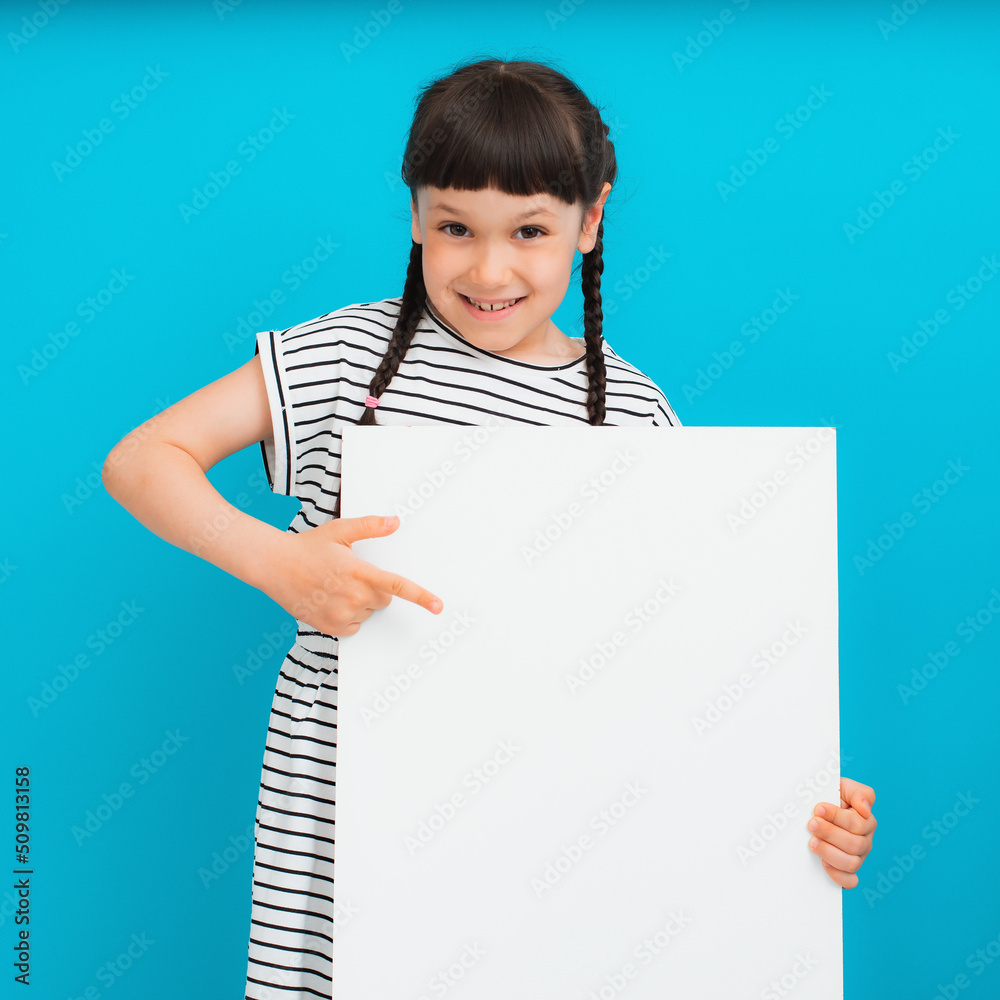 Photo of young happy smiling little girl child kid stand behind white wall isolated on yellow color background
