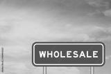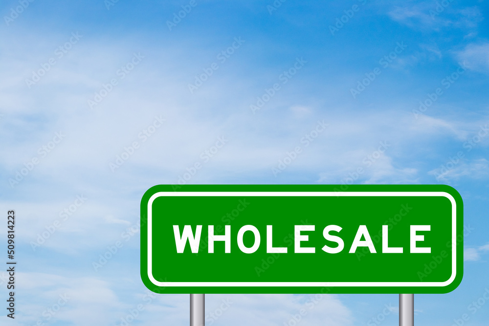 Green color transportation sign with word wholesale on blue sky with white cloud background