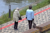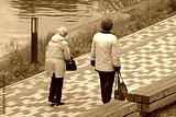 Two elderly women walk along the park alley on a spring day