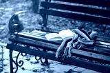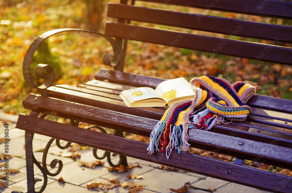 Book and scarf on wooden bench in autumn park.