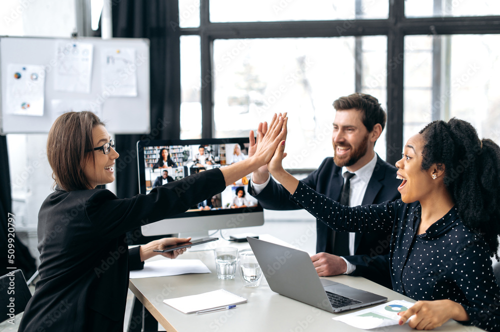 Excited business multiracial colleagues did a great job, they discussing a new project, generating new ideas, brainstorming via video conference with their business partners from different countries