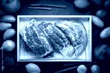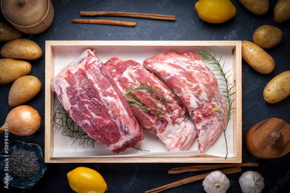 Pork Spare Ribs on black wooden table, Raw Pork ribs with with a rosemary on wooden plate.