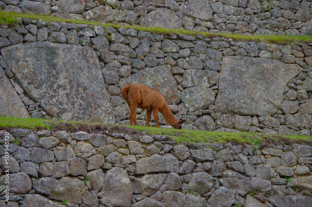 Historic ancient legendary Maya temple ruins lost city Machu Picchu high in Peruvian Andes Mountains, mystic and magic cloud nature landscape atmosphere in Peru with lush vegetation high altitude