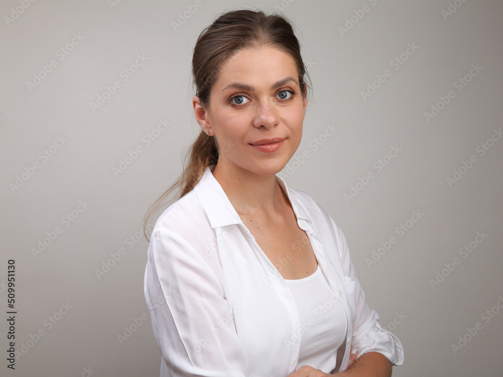 Portrait of smiling woman in white shirt.