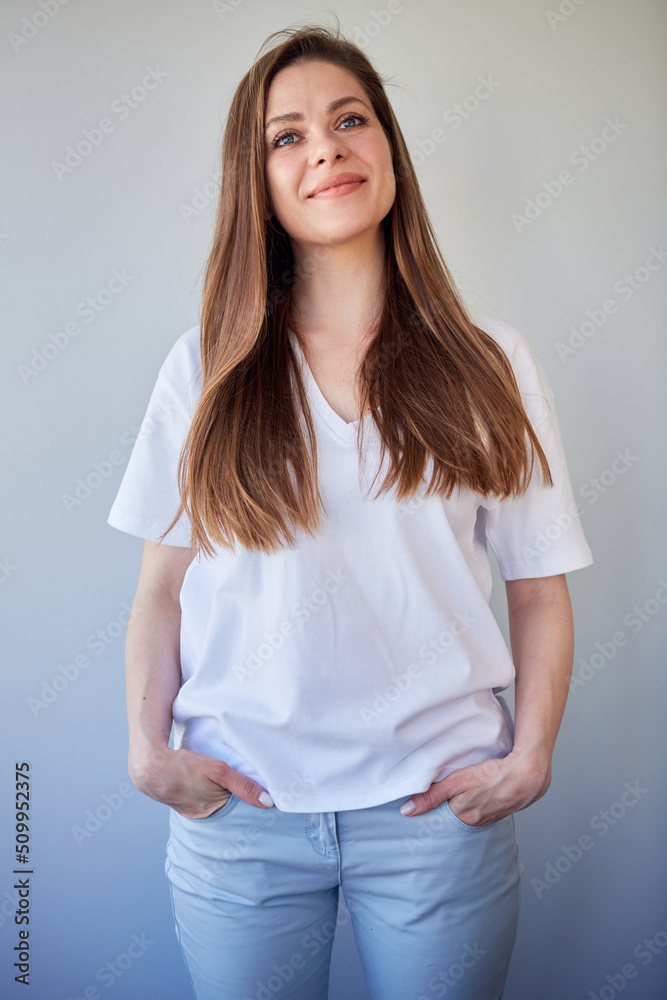 Smiling woman in white shirt looking away and keeps hands in pockets. Happy girl with long brown hair, isolated portrait.
