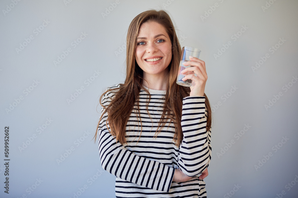 Smiling woman holding glass with water. Isolated portrait of smiling girl wearing white striped shirt
