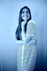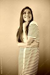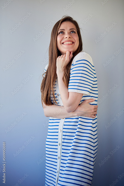Smiling woman in white long dress and brown hair standing with crossed arms, looking away. Woman teacher wearing white dress with blue stripes.