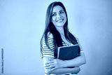 Happy student holding book and looking away. Woman teacher wearing white dress with blue stripes.