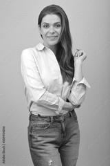 Smiling woman in blue shirt standing in front of gray back. isolated portrait.