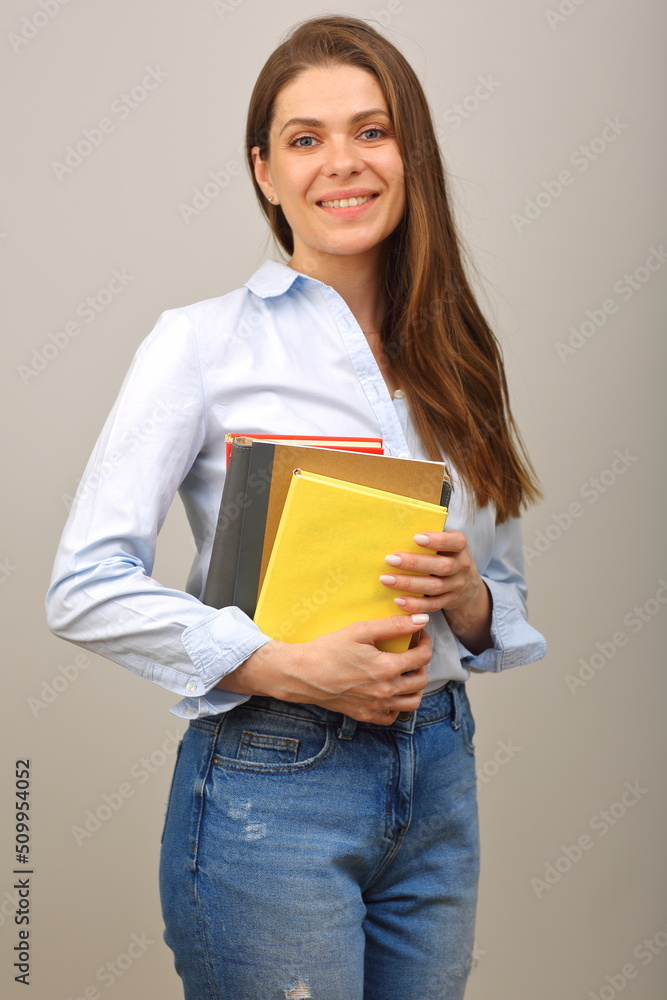 Student woman or teacher in shirt and jeans pants holding book. Smiling girl isolated.