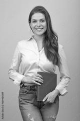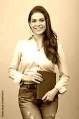 Casual dressed student girl holding book. Smiling woman with long hair portrait isolated.